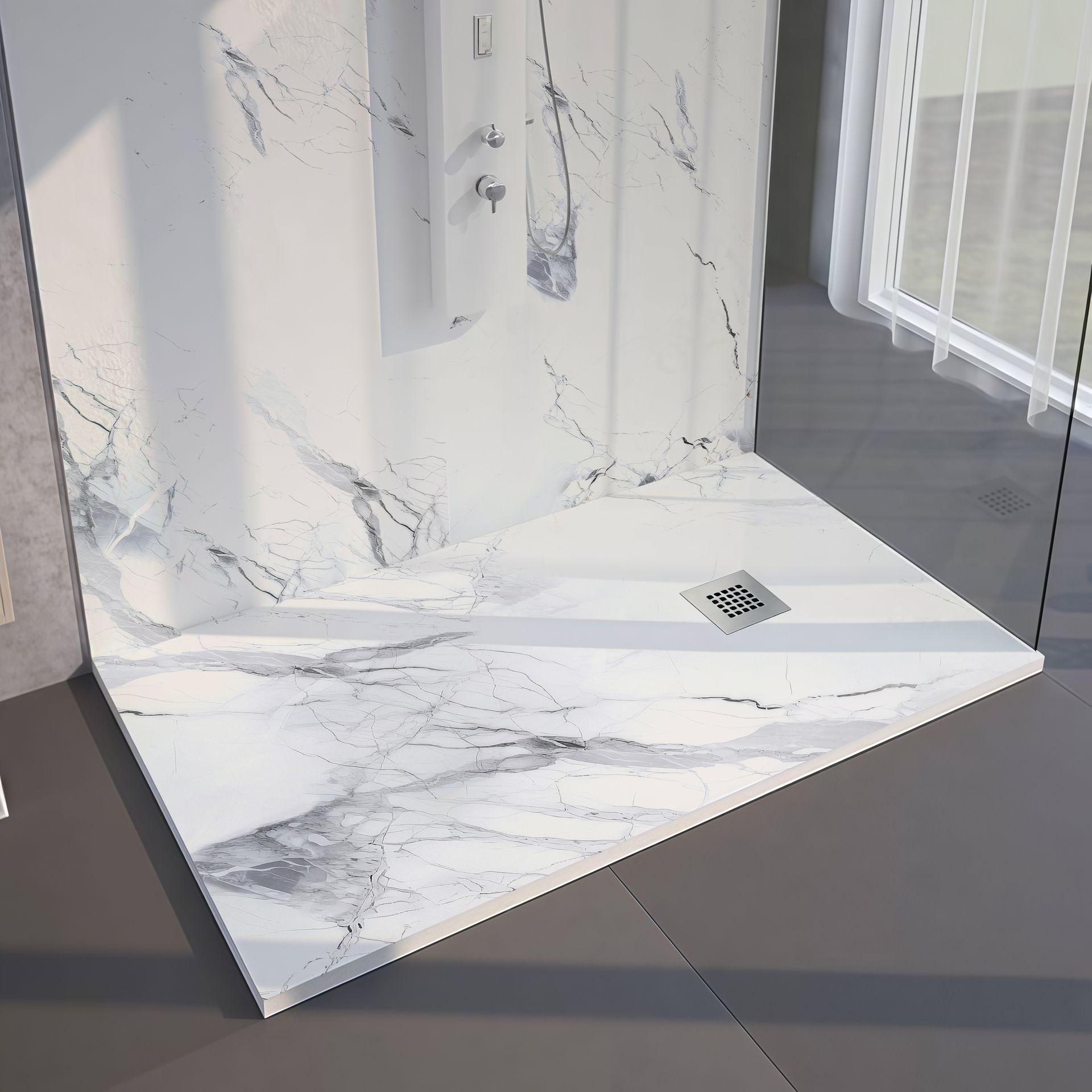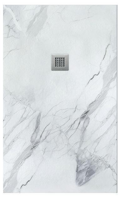 Plato de ducha con acabado efecto mármol tipo Calacatta, en base blanca con vetas grises y azuladas. Un diseño sofisticado y luminoso que aporta amplitud y elegancia al baño, con superficie antideslizante, alta resistencia y fácil mantenimiento.