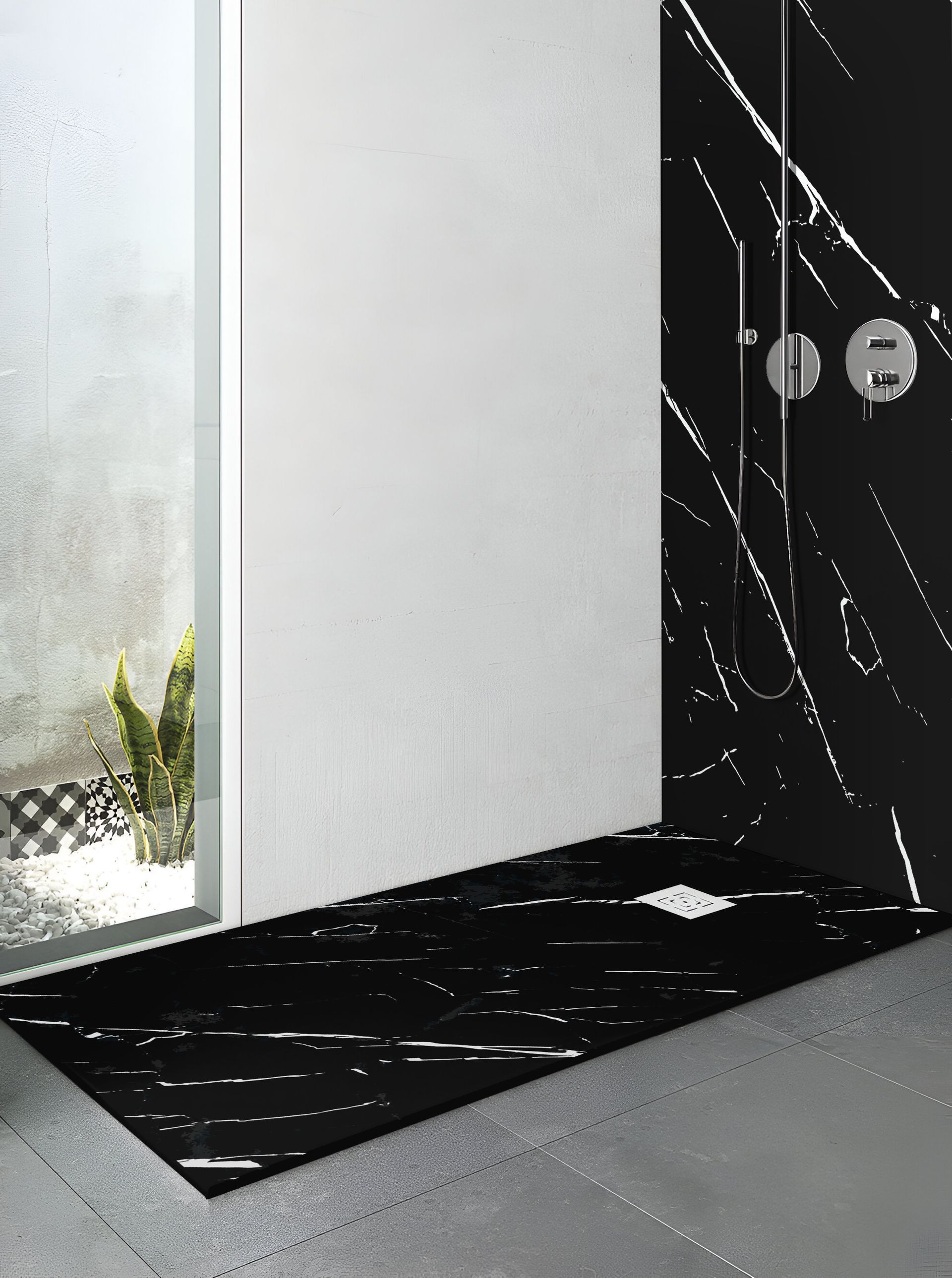 La intensidad del mármol negro con vetas blancas crea una superficie potente, elegante y atemporal. Un plato de ducha pensado para baños modernos que buscan un estilo sofisticado y con mucha personalidad.